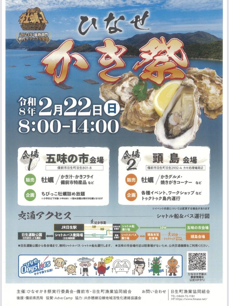 「海のゆりかご」とも呼ばれるアマモ場で育まれた「日生かき」。2024年2月に豊洲市場で行われた第1回全国牡蠣-1グランプリでは、加熱部門で初代グランプリを獲得しました。この自慢の「日生かき」を多くの方々に堪能していただきたく、今年も「ひなせかき祭」を開催します。